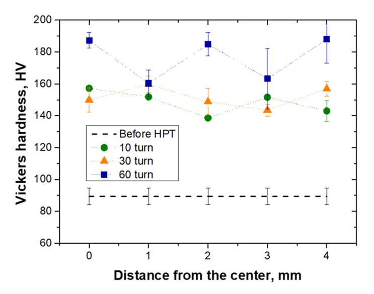 turns. The insert figure in (a) shows the HPT disk sample surface.
