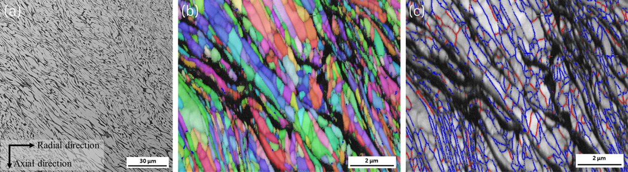 (a) SEM image of HPT processed sample after 60 turns. (b) IPF map of Thin layered