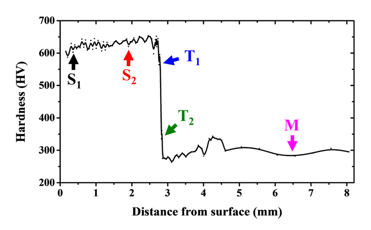 표면부 층에서 중심부(matrix) 쪽으로 이동하면 경도가 급격하게 감소하는 영역인 경계부(transition region)를 확인할 수 있다. 경계부는