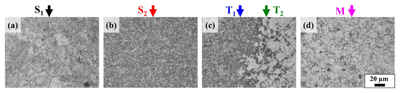 광학 현미경 및 경도 실험 결과를 통해 5가지 영역(M, S1, S2, T1, T2)을 선정하였으며 IQ, KAM 그리고 MA 분포 그래프를 통해 미세구조 변화를 비교하였다.