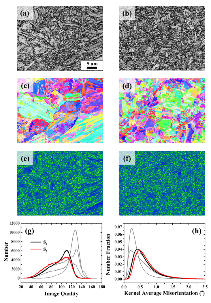 그림 5(g)와 5(h)는 S1과 S2의 IQ 및 KAM 분포를 비교한 것이다. 두 영역 모두 중심부의 tempering 된 조직과는 차별화된 IQ 및 KAM 분포를 나타내나 두 영역