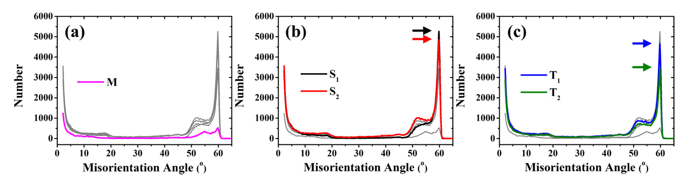 이와는 다르게 그림 7(b)의 60° 부근 MA 분포를 보면 PAG 크기가 더 큰 S1 영역의 boundary 양이 미세하게 증가한 것을 알 수 있다. 기본적으로 60°의 misorientation angle을 갖는 boundary는
