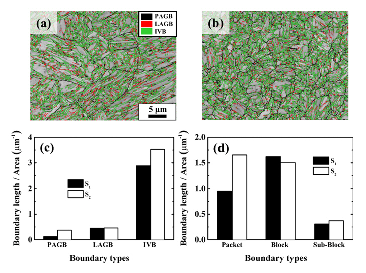 면적당 길이(boundary length per area)를 그림 9(c)에 제시하였다. LAG boundary의 양은 두 영역에서 유사한 모습을 보이나 PAG boundary와 IV boundary의 양은 S1에 비해 S2에서 더 많은 것을 확인하였다. 일반적으로 PAG 크기가 작으면 급냉 시 생성되는 martensite의 하부 구조도 성장에 제한을 받기 때문에 block과