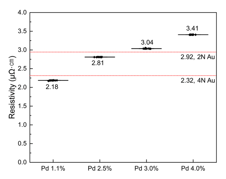 팔라듐 1.32 wt% (4N 금와이어와 동일한 비저항 값), 팔라듐 2.52 wt% (2N 금와이어와 동일한 비저항 값) 조건에서 금와이어와 동일한
