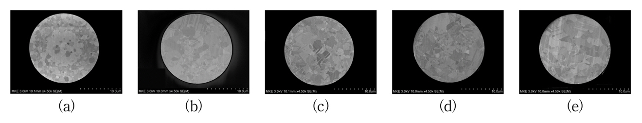 그림 3에는 FE-SEM을 이용해 전자 채널링 콘트라스트이미징 기법으로 관찰된 팔라듐 함량별 와이어 횡단면의 미세조직 이미지를 보여주고 있다. 4N 금와이어의