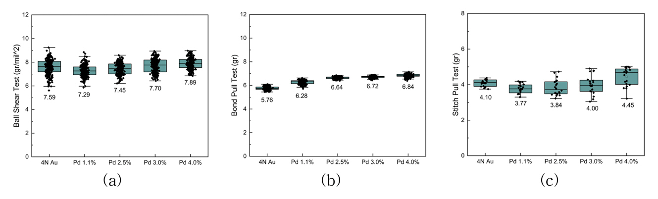 평가용 기판의 금속 패드에 ball bond가 안정적으로 형성된 것을 확인하였다. 팔라듐 함량이 높을수록 인장강도 값이 높기 때문에 4.0 wt%