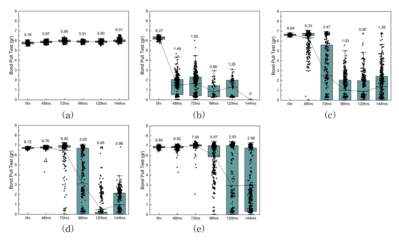 그림 6에는 130°C/85%RH 조건에서 실시된 고습신뢰성 후 시간대별 BPT 결과를 그래프로 나타내었다. 그림 6 (a)는 4N 금와이어의 고습신뢰성 후 시간대별 BPT 결과이다. 금의 경우 144 시간까지 안정적인 값을 유지하였다. 그림 6 (b)는 팔라듐 1.1 wt% 와이어의 고습신뢰성 평가 결과로 48 시간부터 ball lift가 급격히 일어나는 것을 알 수 있다. 그림 6 (c)는 팔라듐 2.5 wt% 와이어의 고습신뢰성 평가 결과로 72 시간부터 ball lift가 급격히 일어나는 것을 알 수 있다. 그림 6 (d)는 팔라듐 3.0 wt% 와이어의 고습신뢰성 평가 결과로 72~96 시간부터 ball lift가 급격히 일어나는 것을 알 수 있다. 마지막으로 그림 6 (e)는 팔라듐 4.0 wt% 와이어의 고습신뢰성 평가 결과로 96시간부터 ball lift가 급격히 일어나는 것을 알 수 있다. 팔라듐 함량에 따라서