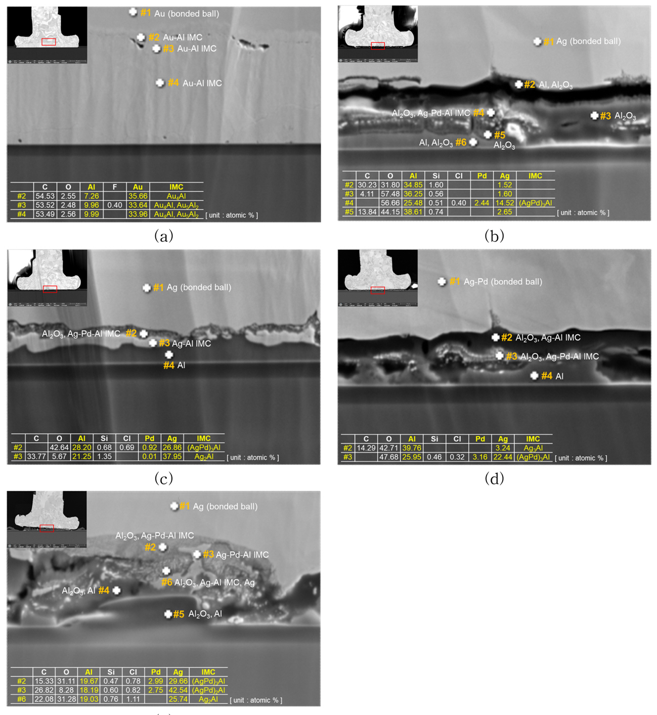 (b)~(e) 결과를 통해 일반적인 균열의 양상은 1st ball bond 하단부의 입방격자 구조의 Ag3Al 층에서 부식이 시작되고 와이어에 팔라듐 함량이 높아질수록 Ag-Pd-Al IMC의 형성이 늘어나면서 IMC의 부식 속도를 전반적으로 늦추는 역할을