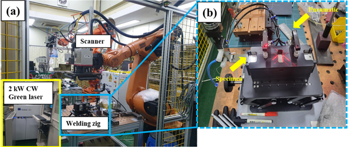 레이저 용접용 발진기는 파장이 532 nm이고 최대 출력인 2 kW TRUMF사의 Trudisk 2021 연속파 그린 레이저를 사용하였고 스캐너(Scanner)를