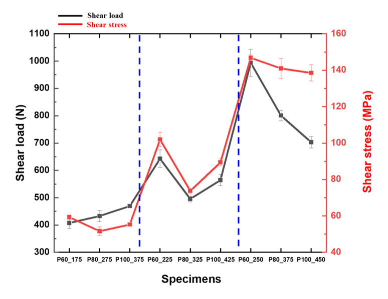 측정되었으며 P60_225, P80_325, P100_425 조건들은 용잎 깊이가 Al영역 20% 이상 50% 미만이며 전단응력 값은 642.7,