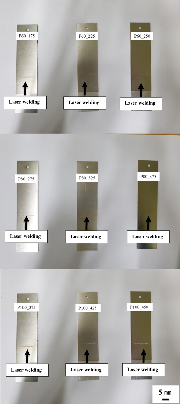 그림 4는 용접 실험 후 사진이며 육안으로 확인한 결과 모든 조건에서 접합이 된 것을 관찰하였다. 그림 5는 용접 속도에 따른 입열량을 보여주며 다음과 같이 계산되었다.