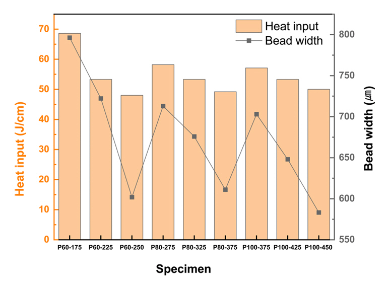 그림 6은 전면 비드 광학현미경 사진이며 P60_175, P80_275 조건들은 높은 입열량으로 인해 비드 주변부에 스패터가 관찰되었으며 일정하지 않은 비드폭을