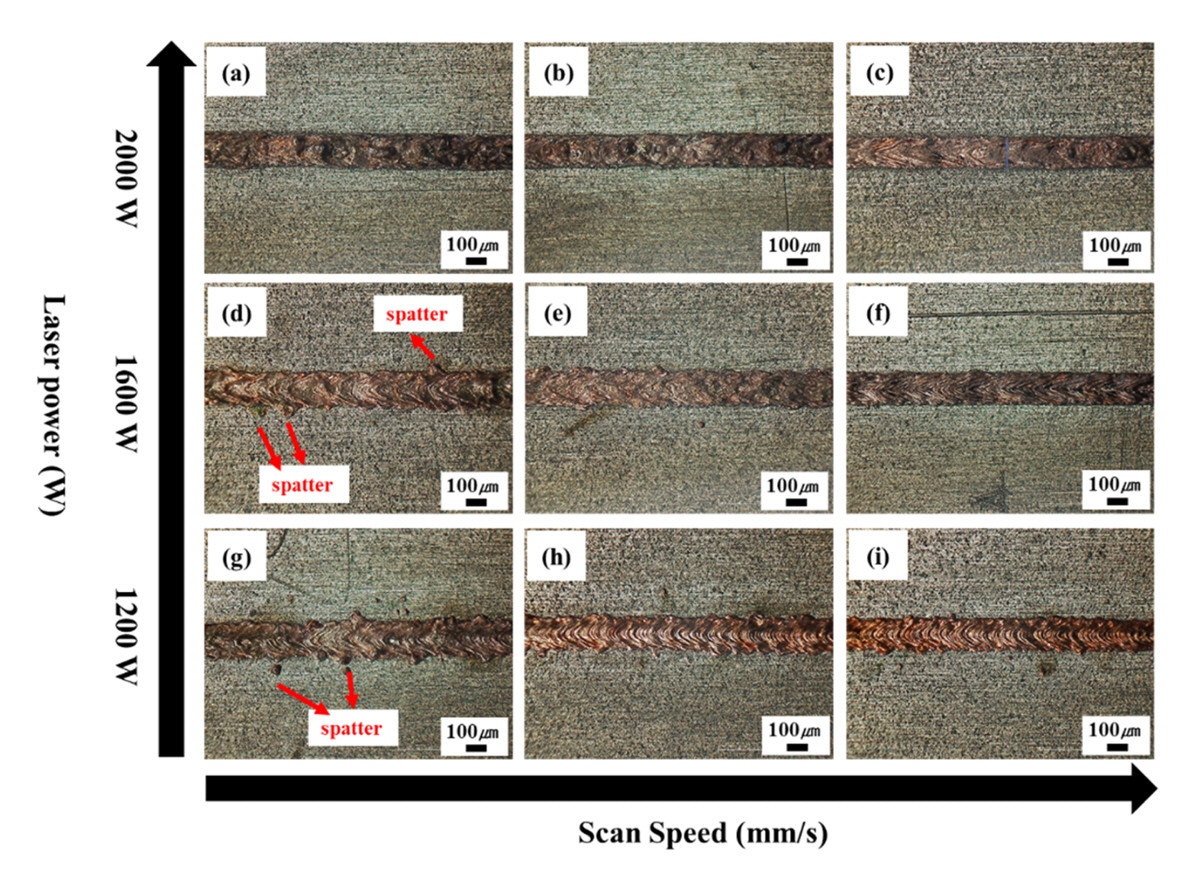 하였다. 용접 소재는 니켈 코팅된 구리와 알루미늄을 사용하였다. 레이저 용접 공정 변수 중 레이저 출력과 레이저 빔(Beam) 주사(Scan) 속도를