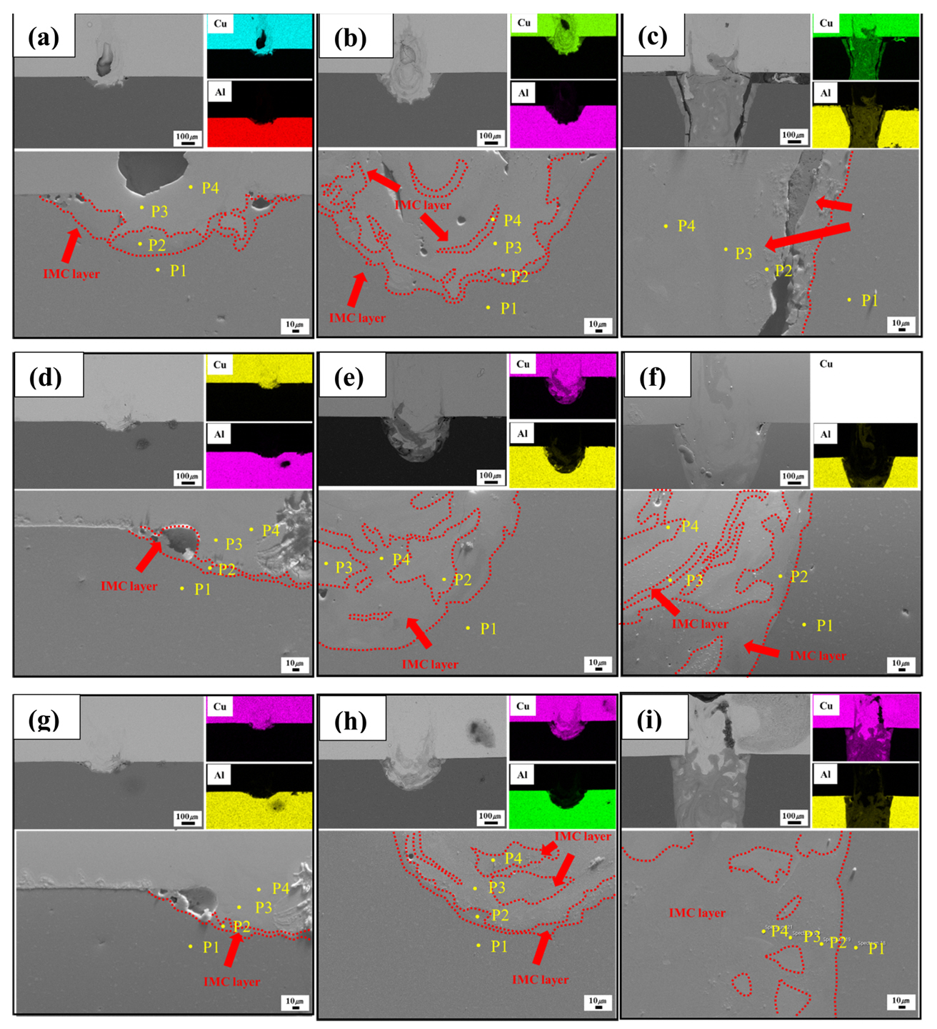 P100_375 조건에서는 용융된 내부까지 금속간 화합물층이 관찰되었다. P80_275, P100_375 조건은 거의 모든 부분에서 CuAl2 및 Cu9Al4 금속간 화합물이 관찰되었다.