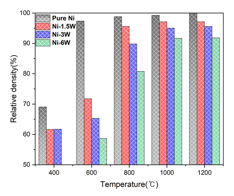 단계에 진입하였다. Ni-1.5W은 800 °C부터, Ni-3W, Ni-6W는 1000 °C부터 최종 소결 단계에 진입하였다. 밀도 측정 결과를 통해