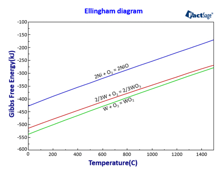 엘링엄 다이아그램(그림 7)에서와 같이 WO2가 NiO보다 열역학적으로 안정하기 때문에 일어나는 것으로 생각할 수 있다. 순수 Ni 시편의 NiO는 환원 분위기하에 식 (9)과 같이 환원되는 반면, W이 첨가된 경우에는 식 (10)와 같이 W이 NiO를 만나 WO2로 변하면서 NiO가 환원되게 된다. 이후 WO2는 환원 분위기에서 식 (11)처럼 W으로 환원되며, 최종적으로 W이 Ni로 고용 된다.