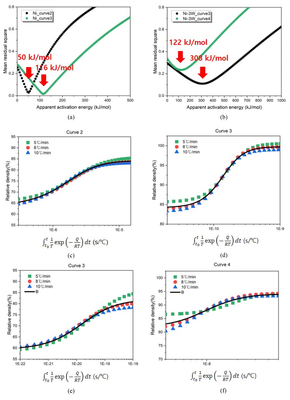 Ni-3W의 최적 MSC는 그림 7(e), (f)에 피팅하였다. 곡선 3번에서 소결 활성화 에너지는 308 kJ/mol로 W이 Ni로 확산될 때의 활성화 에너지인 308 kJ/mol과 유사하며[39], 곡선 4번에서는 활성화 에너지 값은 122 kJ/mol로 Ni의 입계 확산 에너지와 유사한 값을 얻었다. 이러한 결과는 곡선 3 구간에서 Ni의