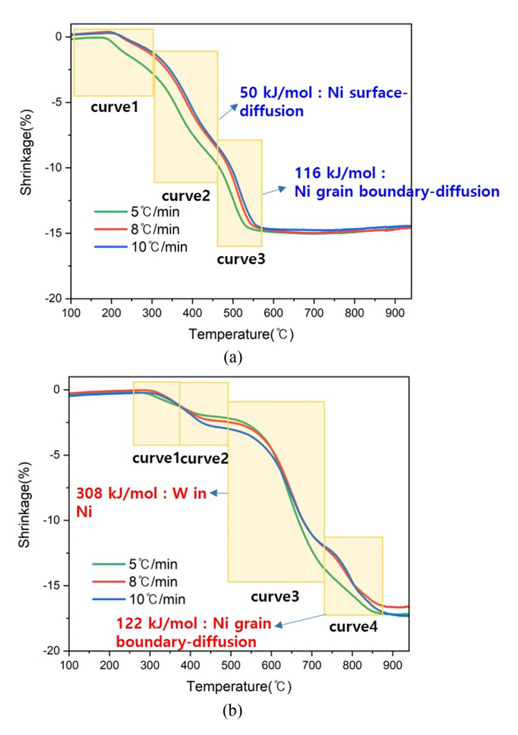 소결 온도가 Ni-1.5W는 순수 Ni 시편 대비 158 °C, Ni-3W는 208 °C, Ni-6W는 243 °C의 증가가 있었으며, 수축률 10