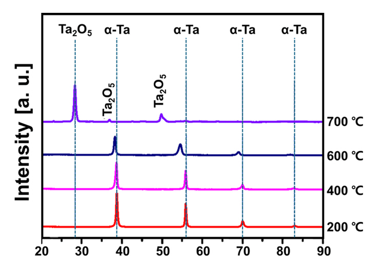 °C 산화 시험 후 확인되 는 Ta2O5 피크들, 그리고 200 °C, 400 °C, 600 °C 조건 간 비교에서 온도가 높아질수록 산화 시험 후 α-Ta 피크가 소폭 왼쪽에서 이동하는