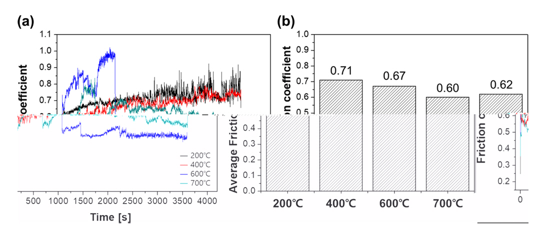 선 및 붉은 선). 그러나 상대적으로 더 고온인 600 °C와 700 °C 조건의 경우, 시험 초기 마찰 계수가 200 °C, 400 °C 온도 조건의