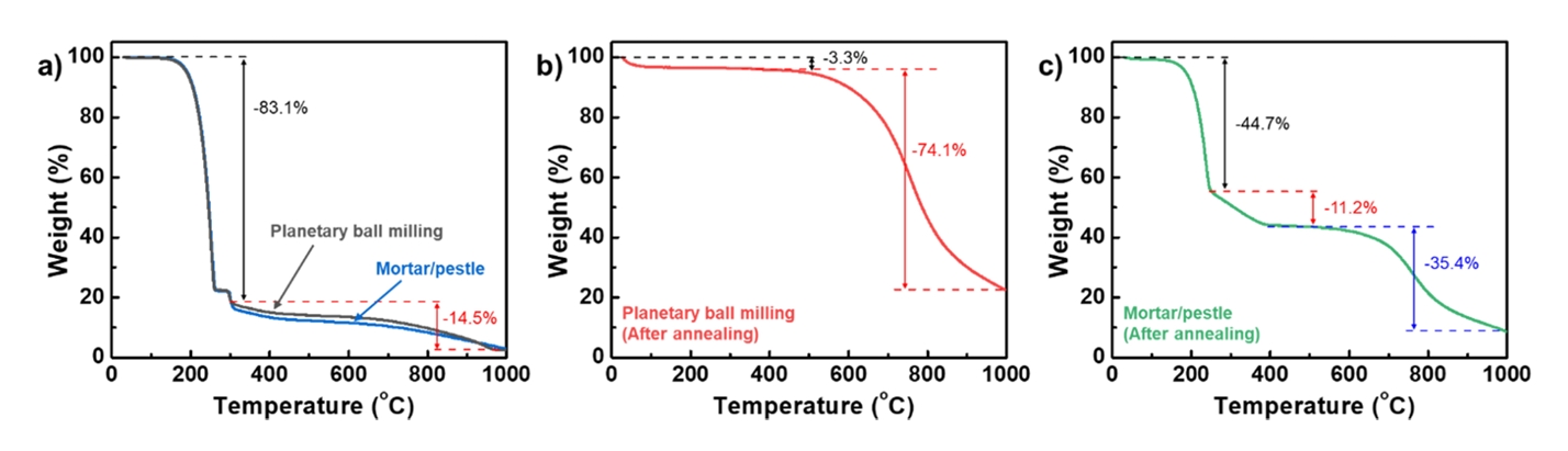 before annealing, and (d) planetary ball milling and (e) mortar/pestle after annealing.