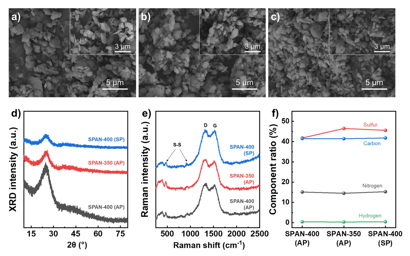 and (c) SPAN-400(SP). (d) XRD patterns, (e) Raman spectra, and (f) composition analysis