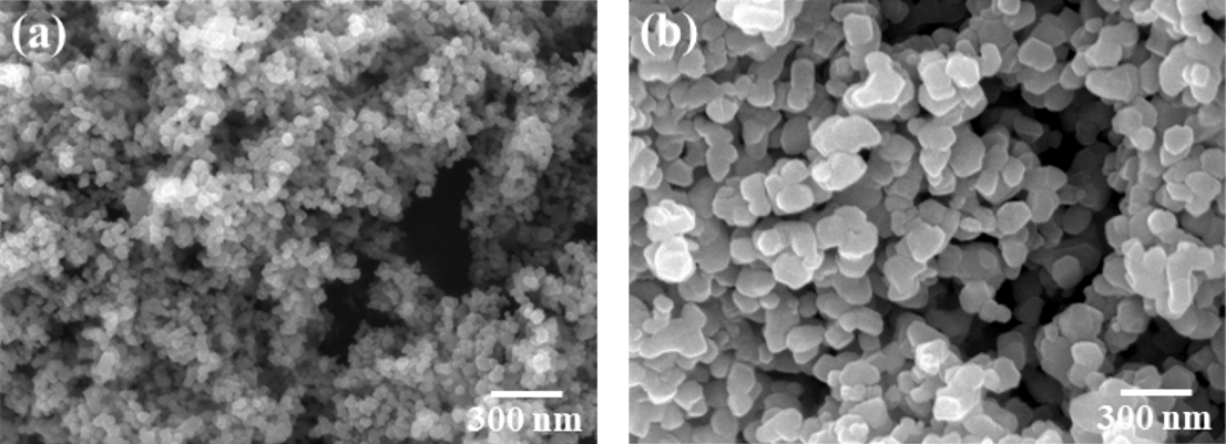 SEM images of (a) the initial and (b) heat-treated TiO2 powder.