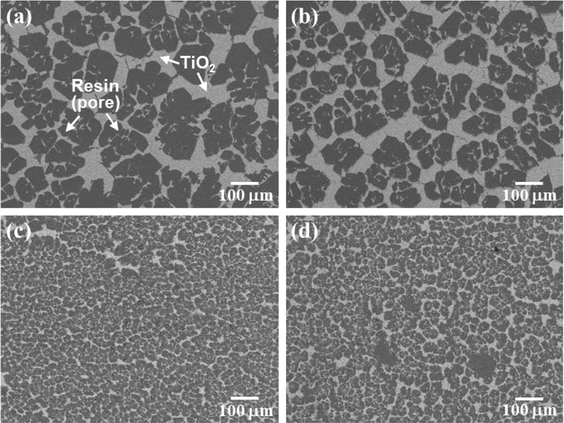 형상 안정성을 갖는 다공체 제조를 위해, 원료인 anatase상의 TiO2 분말은 800°C에서 30분동안 열처리하였으며 XRD 피크의 강도로부터 계산한 rutile 상의분율은 98.6%를 나타내었다. 열처리한 10 vol%