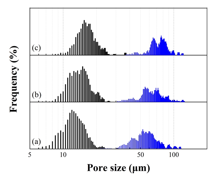 표 1과 그림 5는 동결온도 및 시편의 위치 별 기공크기 및 크기분포를 나타낸 것으로 모든 시편의 하단부 기공은 13.3 ~ 17.5 μm 크기이나 상단부는 63.1