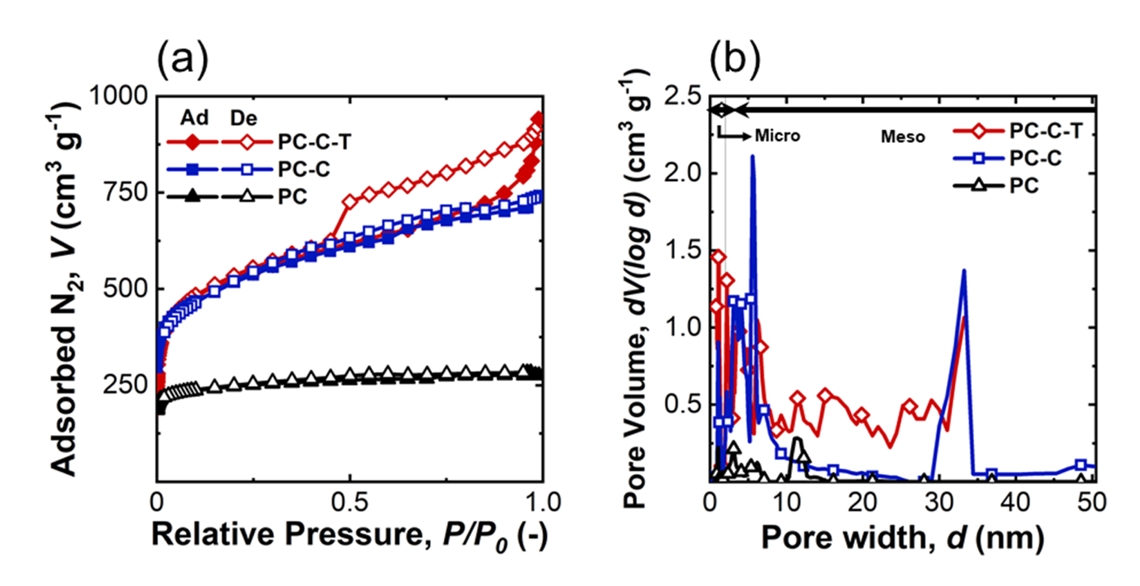 향상에 큰 영향을 주지 않는 것을 확인하였다 (표 1). PC-C-T의 등온 흡착 그래프에서는 흡착과 탈착 그래프 사이의 hysteresis가 발견되며, 이는 전형적인 메조기공 고체(mesoporous