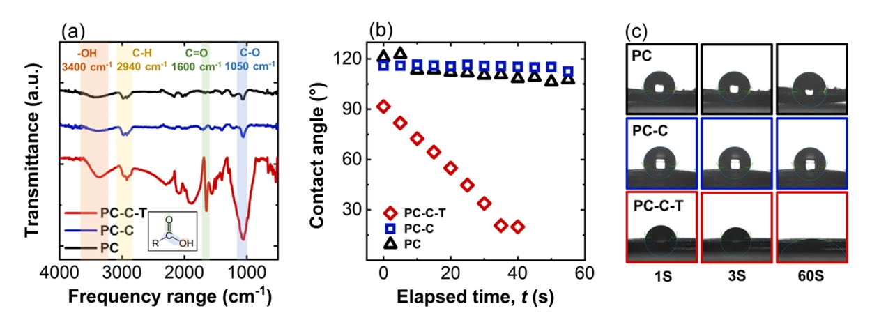 때문이다[41,42](그림 3(b,c)). 극성을 띄는 물방울이 소수성 탄소에 흡착되지 않아 시간이 지나도 접촉각의 변화가 거의 없다[26]. 반면, PC-C-T샘플에서 접촉각은 1초 후 92°에서부터 3초 후 20°로 급격히 감소하였다. 소재의 친수성은 표면 친수성 작용기의 형성 또는
