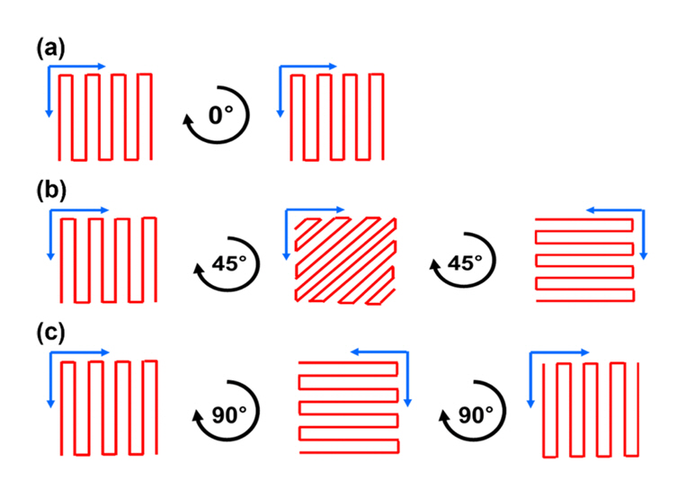 ร 15 ร 15 mm3์ ์ ์ก๋ฉด์ฒด ์ํํธ์ ์ ์กฐํ์๊ณ ์ค์บ ์ ๋ต์ ๋ฐ๋ฅธ ํจ๊ณผ๋ฅผ ํ์ธํ๊ธฐ ์ํด ๊ทธ๋ฆผ 2์ ๊ฐ์ด ๊ฐ๊ฐ์ layer๋ linear ํจํด์ผ๋ก ์ค์บ์ ํ๋ ๋์์ layer ์ ์ธต ์๋ฃ ํ 0ยฐ, 45ยฐ, 90ยฐ ์ด 3์ข