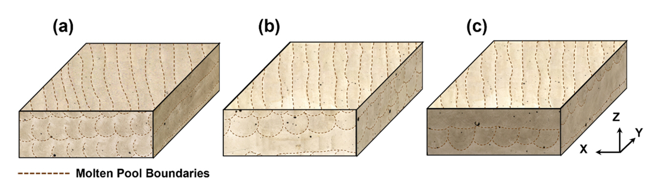 45ยฐ, 90ยฐ๋ก ํ์ ํ์ฌ ์ ์ธตํ์๋ค. ๊ฐ ์์ฌ์ Molten Pool, ์ด์ฐจ์ ๋ฐ ๋ธ๋ก ํฌ๊ธฐ ๋ถํฌ๋ฅผ ๋ถ์ํ๊ธฐ ์ํด ๊ฐ๊ฐ ๊ดํํ๋ฏธ๊ฒฝ ๋ฐ ํ๋ฐฉ์ฐ๋์ ์ํ์ (Electron