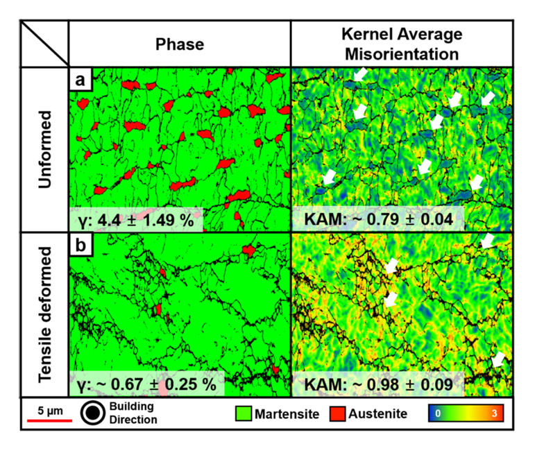 sample: (a) undeformed and (b) deformed state. White arrows indicate the austenite