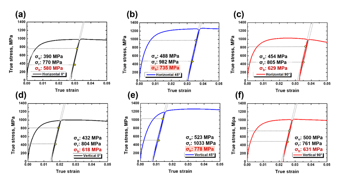 True stress-strain curves of the DED-processed maraging steel after LUR test: (a)