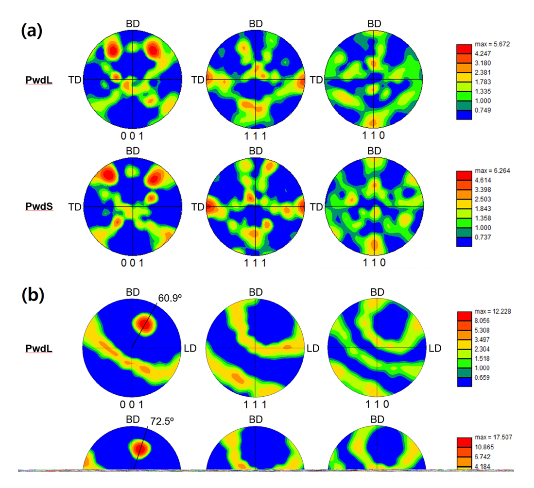 큰 PwdL 조건의 적층체는 TD면에서 평균 134 µm, LD면에서 평균 165 µm의 결정립 크기를 보였고, PwdS의 TD면 평균 198 µm,