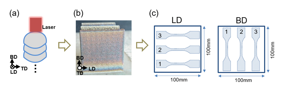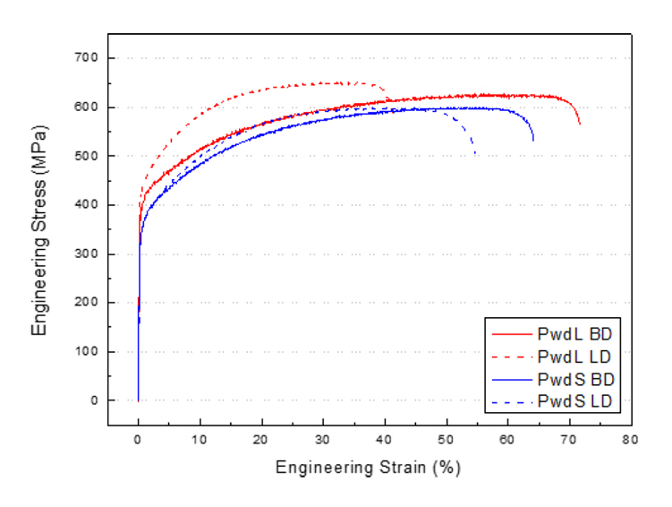 size가 LD 방향에 비해 작기 때문에, Hall-Petch 효과에 따라 BD 방향의 강도가 높은 경향으로 이어진다. 그럼에도 불구하고, 적층소재는