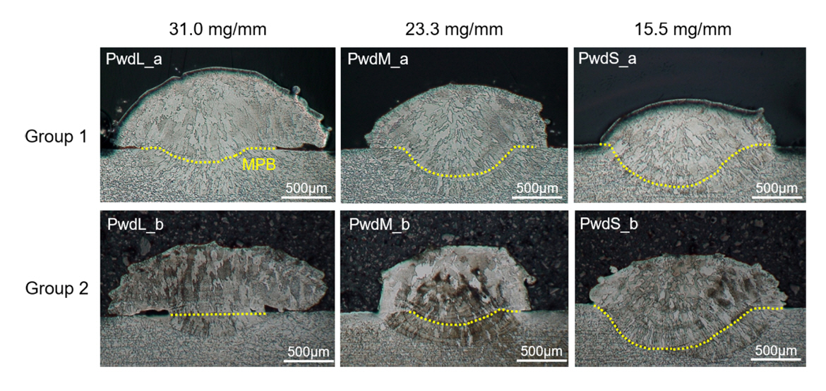 그림 4에 1-line 적층을 통해 생성된 비드 단면의 광학현미경 이미지를 PLD에 따라 나타내었다. 분말 공급 속도를 통해 PLD를 제어한 Group 1과