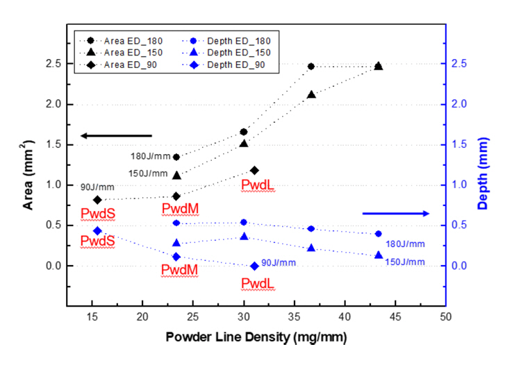 ELD에서도 동일하게 나타났으며 PLD에 따른 비드 단면적과 Melt-pool의 깊이 변화를 그림 6에 나타내었다. 그림 6에서 동일한 PLD 조건에서, ELD가 증가함에 따라 비드의 단면적과 MPB의 깊이가 함께 증가하는 것을 확인할 수 있다. 이는 기존 에너지 밀도와