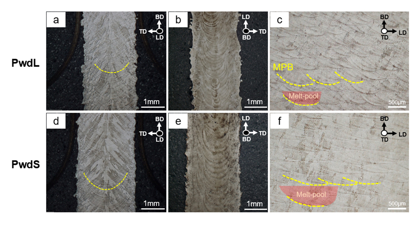 PLD가 작은 PwdS에서는 깊고 넓은 melt-pool이 형성되며 비드와 melt-pool이 유사한 너비를 보였고, 비드와 substrate 사이에서