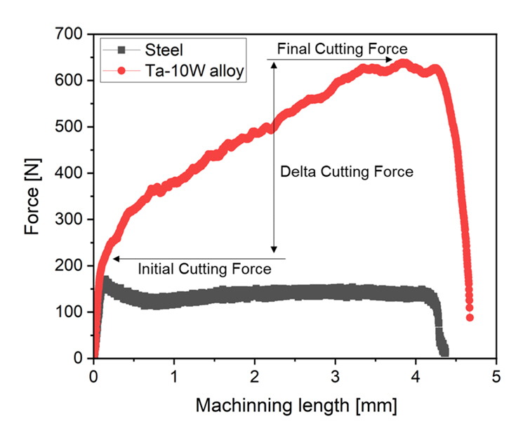 이를 위해서 탄탈륨 합금의 절삭시 발생하는 절삭력을 측정하고 절삭 공정 변수에 따른 절삭력 변화를 탄탈륨-텅스텐 합금의 물성과 연계하여 그 원인을