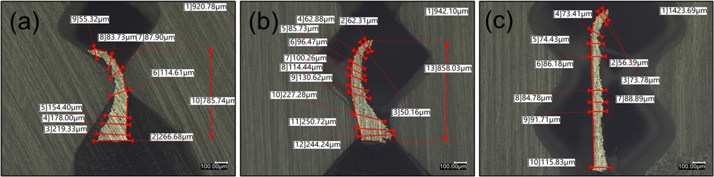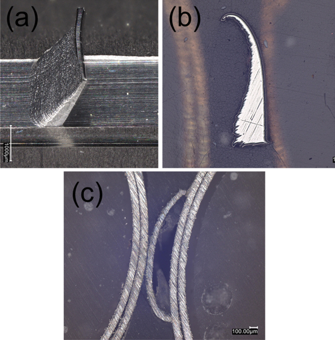 이와 같은 불규칙 형태의 가공 칩이 발생하는 이유는 그림 4(a)에 제시한 결과로 확인 가능하다. 직교 가공이 진행됨에 따라 가공 공구 앞에서 탄탈륨 합금의 두께가 증가하는 현상을 보이고 있으며 이는 단면 관찰