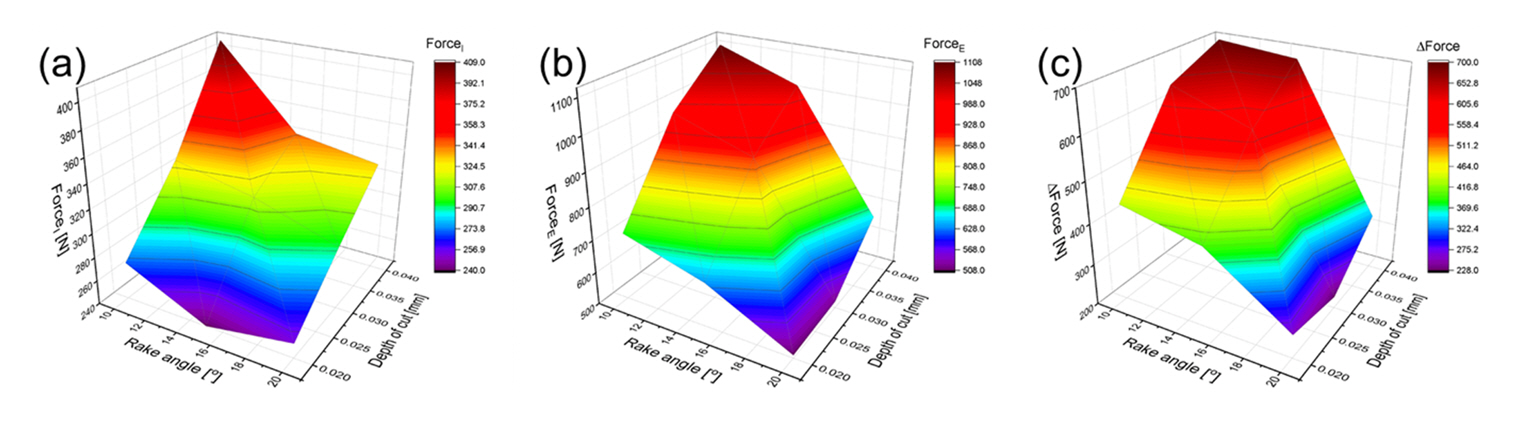 그림 5에서는 가공 툴 각도, 가공 속도, 가공 깊이를 변화시켜 시작 및 끝 절삭력, 그리고 절삭력 변화량을 나타냈으며 그 값을 표 3에 제시하였다. 제시된 결과에 따르면 가공 속도의 증가, 낮은 가공 툴 각도, 절삭 깊이의 증가는 시작 및 끝 절삭력의 상승을 보였다. 그러나 그림에서