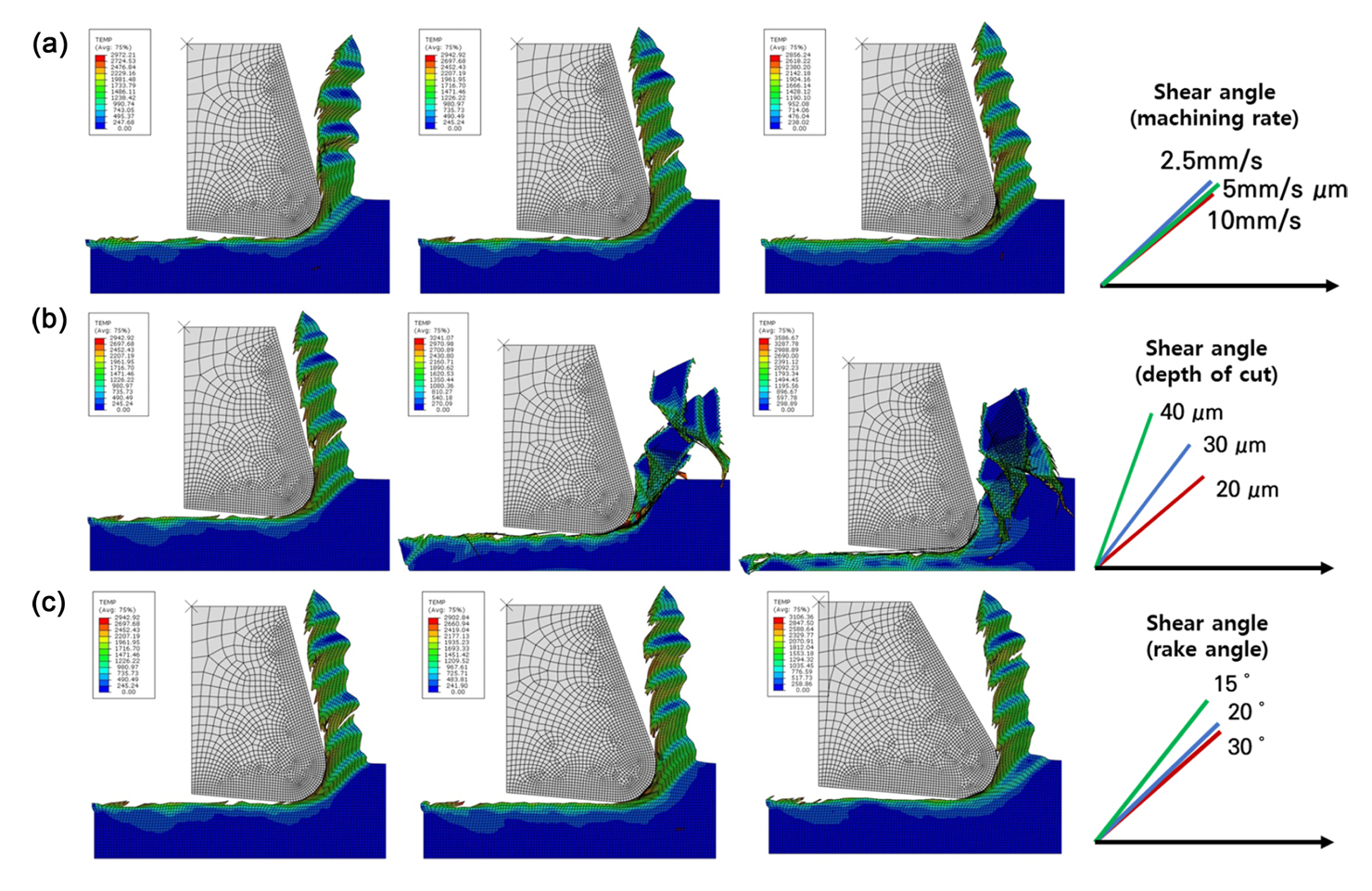 툴 각도가 결정되는 경우, 가공 속도가 증가함에 따라서 전단 변형 방향에는 큰 영향이 없는 것을 예측할 수 있다. 하지만 절삭 깊이는 전단 변형 방향을