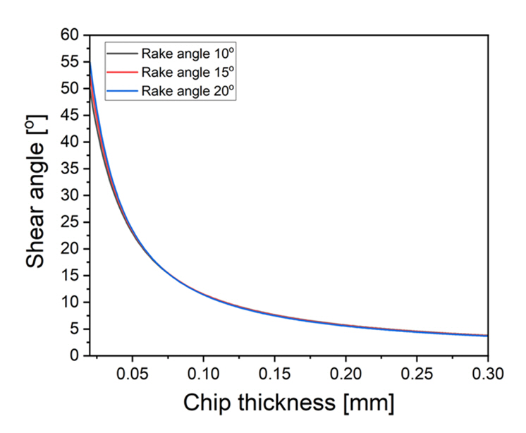 그림에서 확인되는 것과 같이 칩의 두께가 증가함에 따라서 전단 각도는 낮아지는 현상을 보이고 있다. 즉 그림 4에서 제시한 것과 같이 소재의 절단이 발생하지 않은 경우, 더욱 심한 표면 변형을 유도하며 이에 따라 높은 절삭력이 필요로 하게 되는 것을 의미한다.
