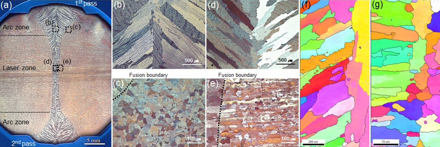 welding heat input, with a wider CGHAZ area in the arc zone (Fig 3c), where the heat input is higher than the laser zone. Figure 3f shows the IPF map of the arc zone weld metal, where the average columnar grain width