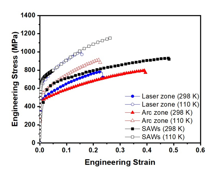 levels (−196 °C)[49], the deformation mode of the arc and laser zones at 110 K shifts to deformation