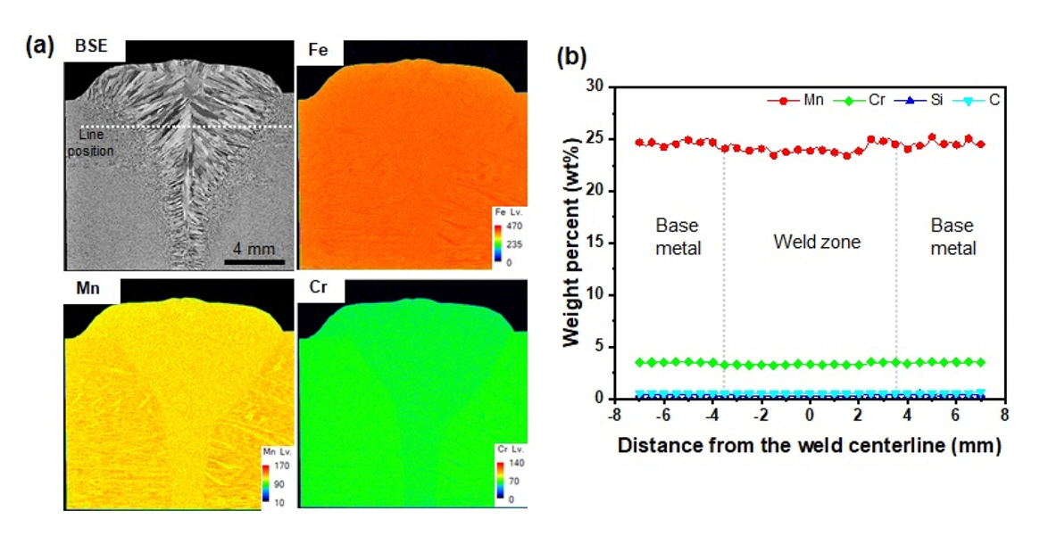 had minimal variation of Mn content (23.7 wt%) as compared to the base metal due to