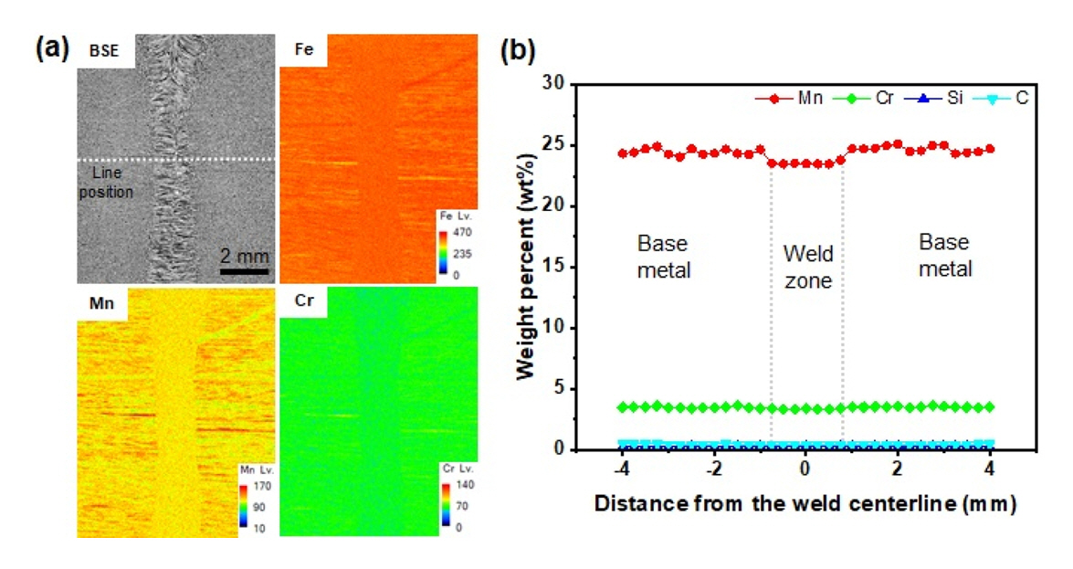 in the BSE image (Fig 8b), and a slight decrease (~0.6 wt%) in Mn content was observed in the weld zone due