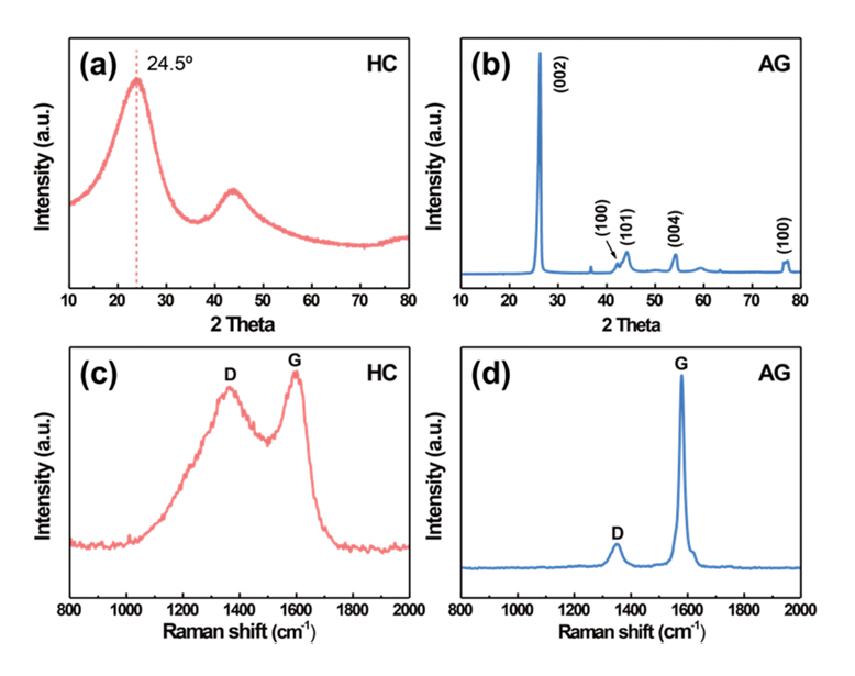 HC과 AG분말의 결정 구조는 X-ray diffraction(XRD)과 라만 분광법을 통해 분석하였다(그림 1). HC와 AG의 XRD 패턴은 그림 1(a-b)에 제시되었다. 그림 1(a)는 HC의 XRD 패턴의 결과를 보여주고 있으며, 약 24.5° 와 43.6° 에서 넓은 회절 피크가 나타나 이전에 보고된 하드 카본의 XRD 패턴과